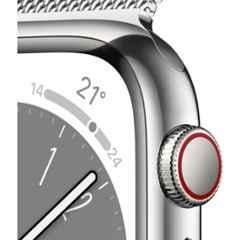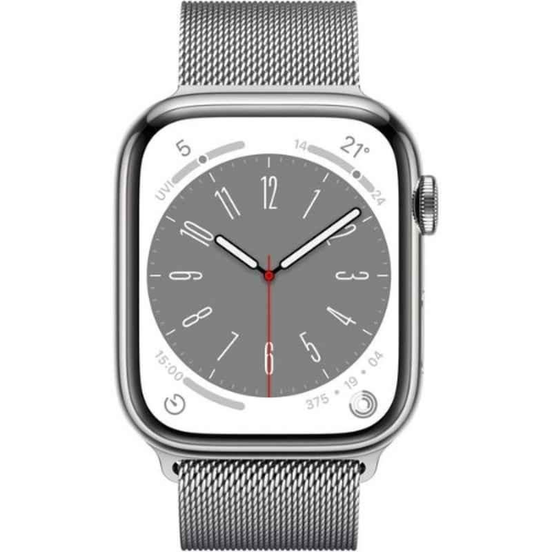 Introducing the latest addition to the Apple Series-8 lineup, the 41mm Stainless Steel Case Silver GPS + Cellular Watch with Milanese Loop. This sleek and stylish timepiece is packed with advanced features including a battery life of up to 18 hours, blood oxygen app, ECG app, high \u0026 low heart rate notifications, irregular rhythm notification, temperature sensing, and cycle tracking with retrospective ovulation estimates. For added safety, it also includes emergency SOS, fall detection, crash detection, and international emergency calling. With a redesigned compass app, always-on altimeter, and GPS, this watch is perfect for outdoor adventures. Get yours today and experience the future of wearable technology. Package includes the watch with Milanese Loop and USB-C magnetic fast charging cable. Available in silver, the Series 8 watch is the ultimate accessory for tech-savvy individuals. Item code: MNJ83AE/A.