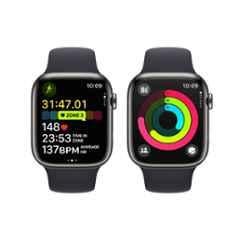 Stay connected and active with the Apple 9 45mm Graphite SS Case GPS \u0026 Cellular Smart Watch. This sleek device features a stunning 45mm display, perfect for checking messages, tracking your fitness goals, and more. With water resistance up to 50m, you can take this smartwatch with you anywhere, whether you're at the gym or out for a swim. The included M/L Midnight Sport Band provides a comfortable and customizable fit, so you can wear your smartwatch all day long. Keep up with your life on the go with the Apple 9 Smart Watch.