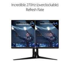 Introducing the ASUS ROG Strix XG27AQM, a high-performance gaming monitor that takes your gaming experience to the next level. With a 27-inch display size and WQHD 2K resolution, immerse yourself in stunning visuals that deliver incredible clarity and detail. The monitor boasts a blazingly fast refresh rate of 270 Hz, ensuring smooth and fluid gameplay with minimal motion blur. Whether you prefer desk or wall mounting, the versatile design caters to your needs. The package includes everything you need to get started, from the monitor itself to power cords, adapters, cables, and even a ROG sticker for true gaming enthusiasts. With its sleek black design, this monitor is a stylish addition to any gaming setup. Powered by a voltage of 240V, the ASUS ROG Strix XG27AQM is ready to take your gaming performance to new heights.