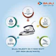 Introducing the Bajaj Majesty 1000W Blue \u0026 White Dry Iron, DX11, a reliable and efficient companion for your ironing needs. This electric iron falls under the category of Electric Irons, made by the renowned brand Bajaj. With a power consumption of 1000W, it heats up quickly and effortlessly removes stubborn wrinkles from your clothes. The compact dimensions of 22.5x11x10.5 cm make it easy to store and handle. Its lightweight design, weighing only 0.789 kg, ensures ease of use and portability. The Bajaj Majesty 1000W Blue \u0026 White Dry Iron, DX11, features a sleek and ergonomic design, making it a stylish addition to your household essentials. So, say goodbye to creases and wrinkles with this reliable and efficient electric iron from Bajaj.
