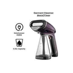 Introducing the Black \u0026 Decker 1500W Black \u0026 Clear Portable Handheld Garment Steamer, the perfect addition to your appliances and utilities collection. With a capacity of 0.26 L, this powerful steamer is designed to quickly and efficiently remove wrinkles from your clothes. The sleek black and clear design adds a touch of sophistication to any home, while the 1500W power ensures fast and effective steaming. Item Code HST1500-B5 is a must-have for anyone looking to keep their clothes looking fresh and crisp. Upgrade your steaming experience with the reliable and convenient Black \u0026 Decker Handheld Garment Steamer.