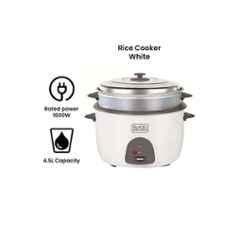 Introducing the Black \u0026 Decker 1600W 240V Aluminium White Electric Non Stick Rice Cooker, RC4500-B5, the perfect addition to your kitchen appliances collection. Made with durable plastic material and a sleek white finish, this rice cooker has a generous capacity of 4.5 L, ideal for preparing large batches of rice. With a powerful 1600 W motor and 240 V voltage, this cooker ensures fast and efficient cooking. The non-stick coating makes cleaning a breeze, while the included item code RC4500-B5 guarantees quality and authenticity. Upgrade your cooking experience with this reliable and stylish Black \u0026 Decker rice cooker.