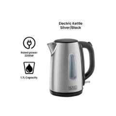 Introducing the Black \u0026 Decker 2200W 240V Stainless Steel Silver \u0026 Black Electric Kettle, JC450-B5, a sleek and modern addition to your kitchen appliances collection. Made with high-quality stainless steel, this electric kettle has a capacity of 1.7 liters, perfect for making multiple cups of your favorite hot beverages. The silver and black color scheme adds a touch of elegance to your kitchen decor. With a power of 2200 watts and voltage of 220-240 volts, this Electric Kettle boils water quickly and efficiently. Upgrade your kitchen with the Black \u0026 Decker Electric Kettle today!