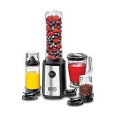 Introducing the Black \u0026 Decker 300W 240V Stainless Steel Black \u0026 Clear 4-in-1 Compact Sports Blender \u0026 Smoothie Maker with Citrus Juicer \u0026 Grinder Mill, SBX300BCG-B5. This versatile kitchen appliance packs a powerful punch with its 300W motor and 21500 rpm speed, perfect for blending up smoothies, juices, and even grinding up spices. The package includes a blender/smoothie maker with citrus juicer \u0026 grinder mill, all in a sleek black \u0026 clear design. With a 550 ml capacity juice cup, this compact appliance is a must-have for any kitchen. Get your hands on the Black \u0026 Decker SBX300BCG-B5 for all your blending needs.