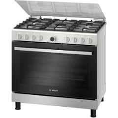 Introducing the Bosch 90cm 5 Burner Stainless Steel Gas Cooker, model HGV1E0U50M. This sleek and stylish cooker from the renowned brand Bosch is the perfect addition to any kitchen. With a generous size of 90cm, this cooker boasts 5 powerful burners, allowing you to cook multiple dishes at once. The stainless steel finish not only adds a modern touch to your kitchen but also makes cleaning a breeze. The energy input for this cooker is gas, ensuring efficient cooking every time. Item code HGV1E0U50M. Please note, the image is for reference purposes only. Upgrade your cooking experience with Bosch.