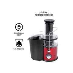 The Geepas 1.6L 800W Plastic Red, Black \u0026 Clear Juice Extractor, GJE5437 is a must-have appliance in every kitchen. Designed to effortlessly extract nutritious juices from a variety of fruits and vegetables, it combines functionality with style. With its plastic construction, this juice extractor is not only durable but also easy to clean. The generous 1.6 liter capacity allows you to make large batches of juice for the whole family. The vibrant red, black, and clear color combination adds a touch of elegance to any countertop. Equipped with an 800W motor, the Geepas Juice Extractor efficiently extracts juice in no time. Upgrade your appliances and utilities with the Geepas brand for top-notch quality and reliable performance.