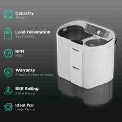 Introducing the Godrej Edge Digi 8.5kg 5 Star Graphite Grey Semi Automatic Washing Machine with In-Built Heater, the perfect addition to your household appliances and utilities. This premium washing machine, brought to you by the trusted brand Godrej, is designed with a sleek and durable plastic body material. With a generous wash capacity of 8.5 kg, you can effortlessly tackle a large pile of laundry in one go. The modern graphite grey color adds a touch of elegance to your space. The model Edge Digi comes with a built-in heater, allowing you to enjoy warm and hygienic wash cycles. With a powerful wash motor power of 460 W and a high speed of 1450 rpm, this washing machine ensures a thorough and efficient cleaning performance. Additionally, it offers five versatile wash programs, catering to different fabric types and washing needs. Upgrade your laundry routine with the Godrej Edge Digi 8.5kg 5 Star Graphite Grey Semi Automatic Washing Machine with In-Built Heater for a superior washing experience.