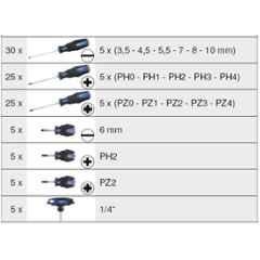 Package Contents | 1 Set Contains 5 Pcs 3.5 mm, 5 Pcs 4.5 mm, 5 Pcs 5.5 mm, 5 Pcs 6 mm, 5 Pcs 7 mm, 5 Pcs 8 mm, 5 Pcs 10 mm, 5 Pcs PH0, 5 Pcs PH1, 10 Pcs PH2, 5 Pcs PH3, 5 Pcs PH4, 5 Pcs PZ0, 5 Pcs PZ1, 10 Pcs PZ2, 5 Pcs PZ3, 5 Pcs PZ4 & 5 Pcs 1/4 inch T-Handle |