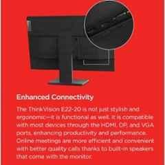 The Lenovo ThinkVision E22-20 21.5 inch FHD IPS Panel Raven Black LED Monitor is a sleek and stylish addition to your workspace. With its 21.5 inch display size, you can enjoy a clear and vibrant viewing experience. The monitor boasts a brightness of 250 nits, ensuring that your visuals are crisp and bright. Its dimensions of 13.1x40.5x61 cm make it a compact choice for any desk setup. The refresh rate of 60 Hz allows for smooth scrolling and action-packed gaming. The Lenovo ThinkVision E22-20 can be mounted on both your desk and wall for versatile placement options. This monitor comes with a comprehensive package that includes the monitor with stand, a power cable, an HDMI cable, and a quick setup guide. With a horizontal view angle of 178 degrees, you can enjoy a wide field of vision. Enhance your productivity and elevate your entertainment with the Lenovo ThinkVision E22-20 21.5 inch FHD IPS Panel Raven Black LED Monitor.