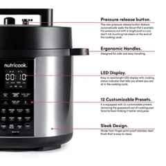 The Nutricook Smart Pot 2 1000W 6L Black Electric Pressure Cooker, NC-SP204A is a must-have addition to any kitchen. This sleek and modern electric pressure cooker is perfect for busy individuals or families looking to save time in the kitchen. With a generous capacity of 6 liters, it can easily prepare meals for the entire family. The black and silver design adds a touch of sophistication to any countertop.