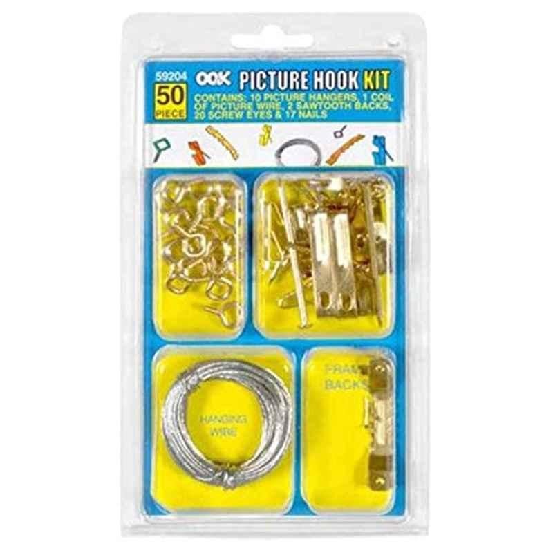 Add some elegance to your home with the OOK 50Pcs Stainless Steel Gold Picture Hook Kit, 59204. This hardware kit from the trusted brand OOK is made from high-quality stainless steel in a luxurious gold color. Each kit contains 10 picture hooks, 1 coil wire, 2 sawtooth backs, 20 screw eyes, and 17 nails, providing everything you need to hang your favorite artwork or photos. Please note that the image is for reference purposes only. Elevate your home decor with the OOK Picture Hook Kit and showcase your memories in style. Item code: 59204.