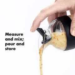 Introducing the OXO 1L S Tritan Black Salad Dressing Shaker, model number 1268980, a sleek and functional addition to your kitchenware collection. This cylindrical-shaped shaker is made from durable Tritan material, ensuring it is both lightweight and shatterproof. The small size makes it perfect for storing and serving your favorite salad dressings or marinades. With a generous capacity of 1 liter, you can mix up large batches to enjoy throughout the week. The stylish black color adds a touch of sophistication to your kitchen decor. Upgrade your storage and thermoware collection with this OXO salad dressing shaker.