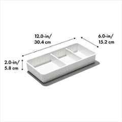Organize your drawers with ease using the Oxo 3Pcs Plastic White Slim Adjustable Drawer Bin Set. This set includes one 3 in x 12 in/7.6 cm x 30.6 cm bin with divider and two 3 in x 6 in/7.6 cm x 15.2 cm bins with dividers, giving you versatile storage options. Made of durable plastic in a classic white color, these bins are both functional and stylish. The adjustable dividers allow you to customize the compartments to suit your storage needs. With a weight of 372 g, this set is lightweight yet sturdy. Keep your drawers neat and organized with this Oxo drawer bin set in the Storage Bins \u0026 Boxes category.