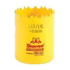 Introducing the Starrett Deep Cut 46mm Yellow Bi Metal Hole Saw, DCH1136-G, the ultimate tool for precise and efficient cutting. This hole saw, part of our Holesaws collection, features a sturdy steel body that can easily cut through metal over 3mm thick, tubes with a wall thickness exceeding 3mm, and wood up to 51mm thick. The bright yellow color ensures high visibility on the job site. Ideal for various applications including metal, non-ferrous metals, cast iron, wood, nail embedded wood, veneer, plastic, acrylic, fiberglass, formica, plaster, and suspended floors wood. The item code for this top-quality hole saw is DCH1136-G, with a cutting depth of 51mm and HSS material teeth. Trust Starrett for all your cutting needs.