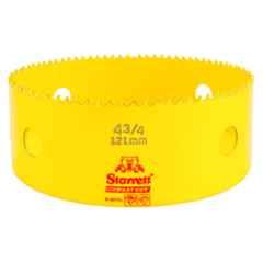Introducing the Starrett Fast Cut 121mm Yellow Bi Metal Hole Saw, ideal for all your cutting needs. This hole saw, with a body material of steel, is perfect for stainless and mild steel sheet and tubes with a wall thickness of up to 3mm. Its vibrant yellow color makes it stand out in your toolbox. The FCH0434-G is versatile and can be used for cutting metal, non-ferrous metals, cast iron, wood, nail embedded wood, veneer, plastic, acrylic, fiberglass, Formica, plaster, and suspended floors wood. With a cutting depth of 41mm and HSS material teeth, this hole saw is durable and efficient. Upgrade your cutting tools with the Starrett FCH0434-G hole saw.