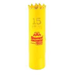 Introducing the Starrett Fast Cut 15mm Yellow Bi Metal Hole Saw, perfect for cutting through stainless and mild steel sheet and tubes with a wall thickness of up to 3mm. This durable hole saw, made with body material steel and featuring HSS teeth, is designed for a wide range of applications including metal, non-ferrous metals, cast iron, wood, nail embedded wood, veneer, plastic, acrylic, fiberglass, formica, plaster, and suspended floor wood. The bright yellow color makes it easy to spot in your toolbox, and with a cutting depth of 41mm, the Starrett FCH015M-G is the ideal choice for your cutting needs. Item code FCH015M-G is a must-have for any professional or DIY enthusiast looking for a reliable and efficient hole saw.