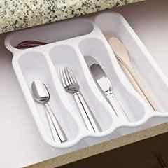Easily organize your kitchen drawers with the Sterilite Plastic White 5 Compartments Cutlery Tray (Model 111144). Crafted from durable plastic in a sleek white color, this cutlery tray features five compartments to neatly store your utensils. Perfect for keeping knives, forks, spoons, and other kitchen essentials in place, this tray is a must-have for any home cook. The Sterilite brand is known for its high-quality kitchen and pantry supplies, making this cutlery tray a reliable and stylish addition to your kitchen organization arsenal. Upgrade your kitchen drawers with the Sterilite Plastic White 5 Compartments Cutlery Tray today.