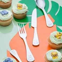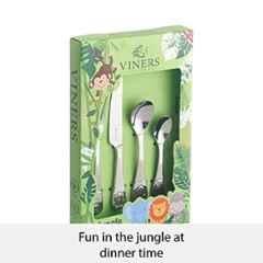 Introducing the Viners 4Pcs 24.5cm Stainless Steel Silver Jungle Kids Cutlery Set, model 802370. Made with durable stainless steel, this set is perfect for your little ones. The fun jungle design will surely capture their imagination during meal times. Each set includes a table knife, table fork, dessert spoon, and tea spoon, all measuring 24.5cm in length. The blade edge is plain for smooth cutting and eating. Add a touch of whimsy to your kitchen with this adorable set from Viners. Perfect for young chefs in training, this cutlery set is a must-have in your kitchen \u0026 pantry supplies collection.